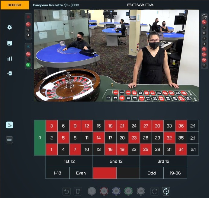 Click on the image to the right to see a game from Bovada. As you can see, it’s a real wheel, real table, real croupier and you can see the dealers for the card games in the background. The overall quality is excellent and you can choose you preferred camera angle at any point in the game.
